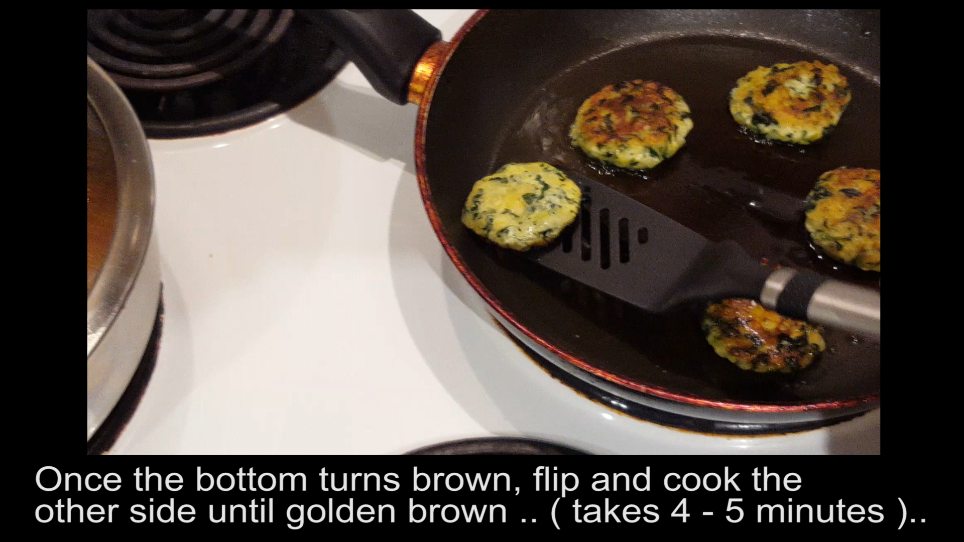 - Place 3 - 4 patties and shallow-fry until the bottom-side turns golden brown .. ( takes 4 - 5 minues on medium-heat )