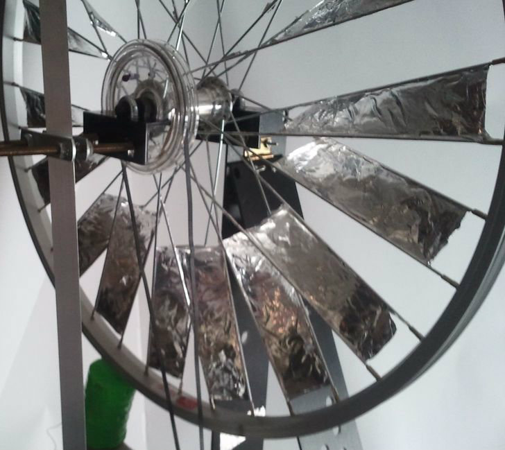 To make the blades on the wheel place aluminum tape on the spokes. Leave a small gap at the top and bottom. See the pic and copy it.