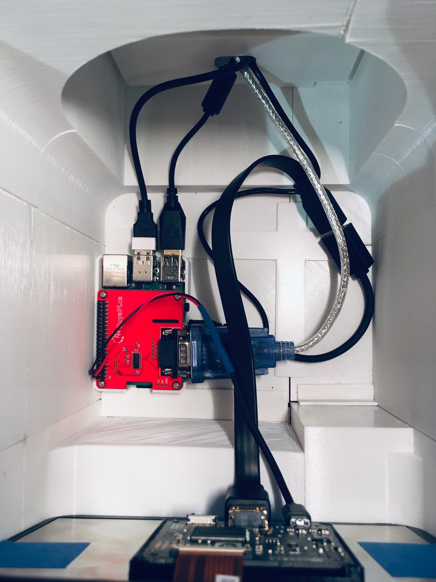 - It's a little hard to see but I printed a "caddy" for the Pi (with hat) and glued it to the bottom of reproduction. I then secured the Pi into this holder with double sided tape.