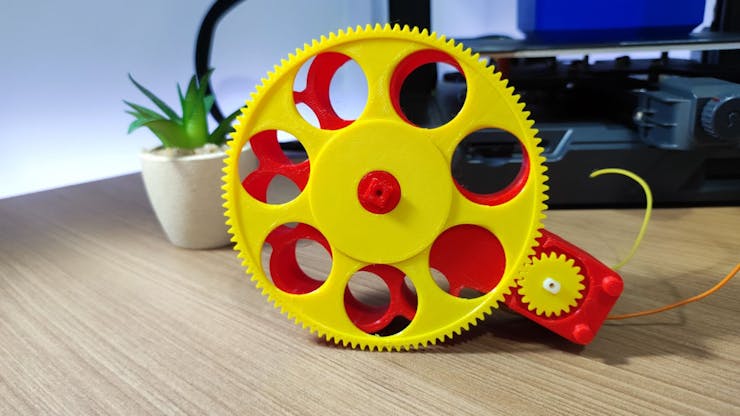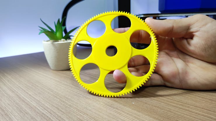 The smaller gear will be coupled to a direct current motor. The larger gear will be coupled to the smaller one and will be used to move the coins.