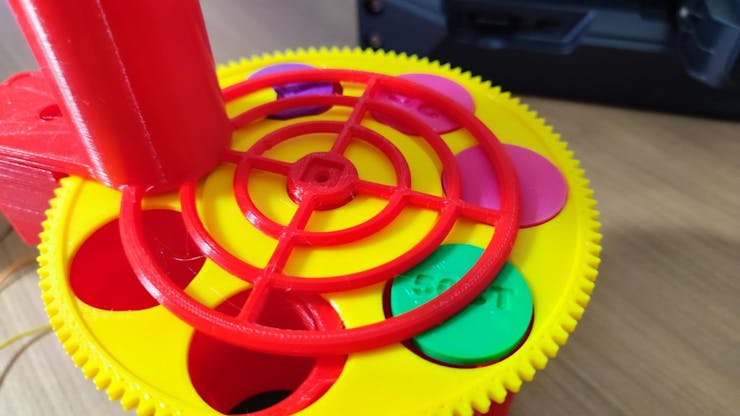 As you can see, the DC motor is coupled to the smaller gear and this will transmit the movement to the larger gear. The larger gear is made up of several circular holes. These holes will be used to move the coins to their respective locations.
