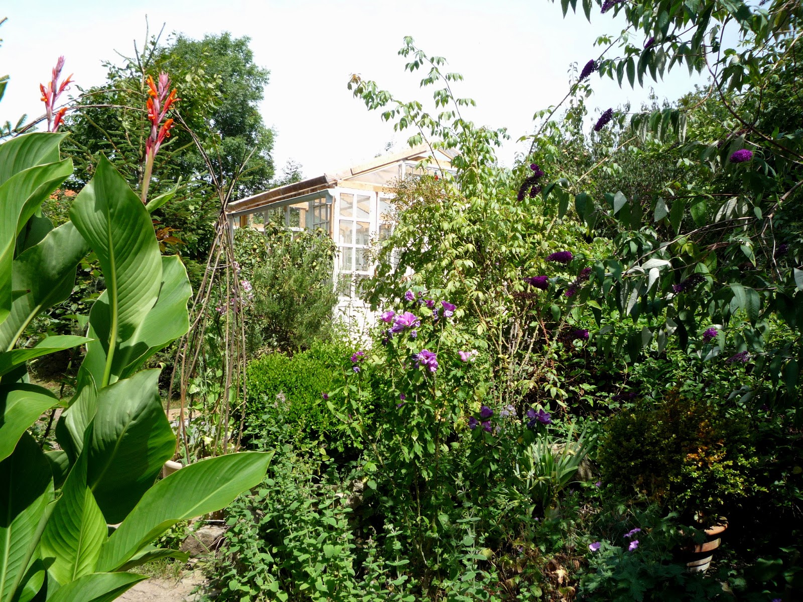 Although it is a large sized greenhouse and in itself quite an imposing feature, it actually fits very well into its surrounding landscape. Being surrounded by greenery as it is now, obviates the need for shade cloths, which in the early days were necessary to prevent the scorching of leaves in the very hot, clear days of Summer. We live near the sea and at times the light here can be very intense.