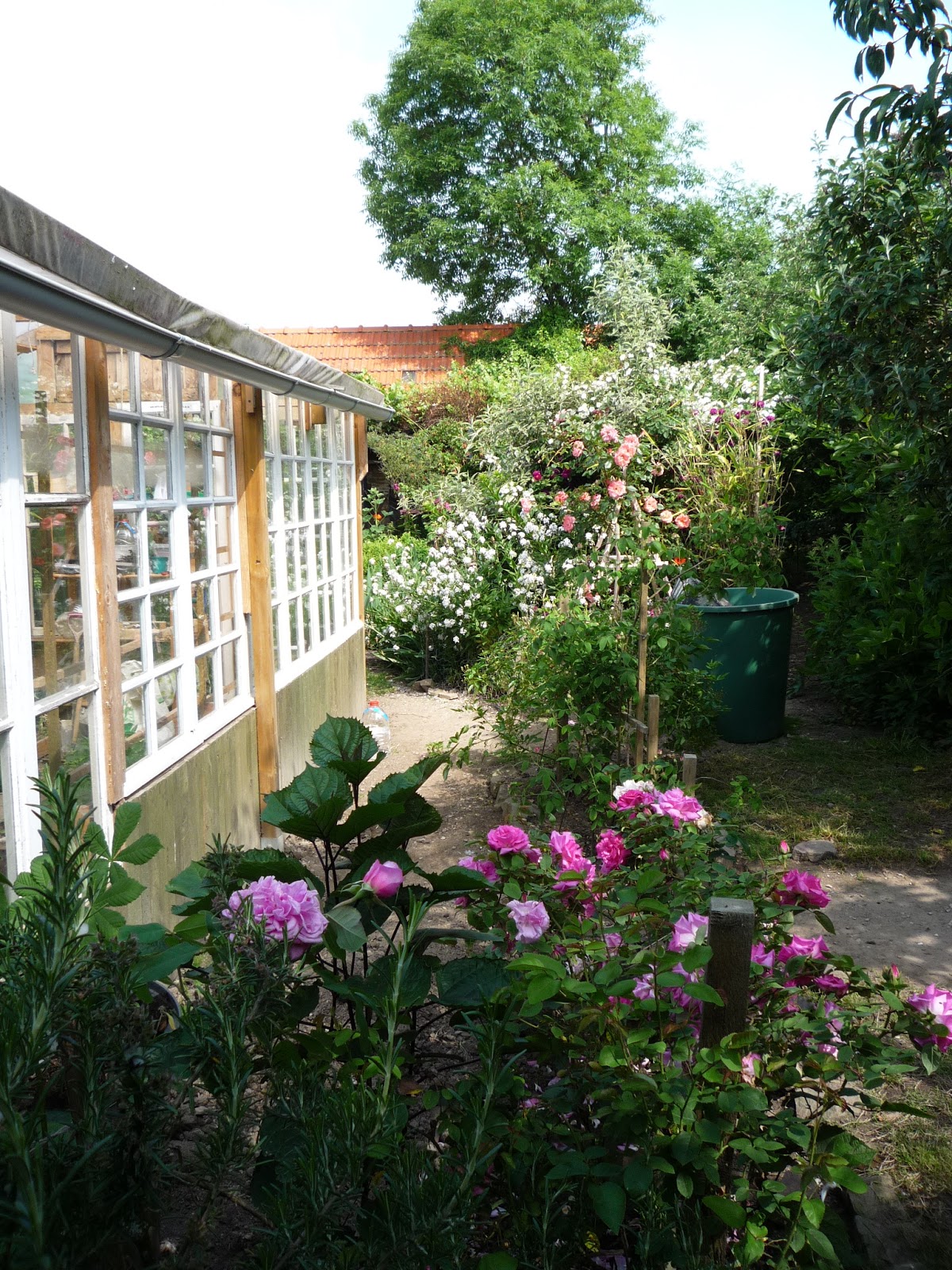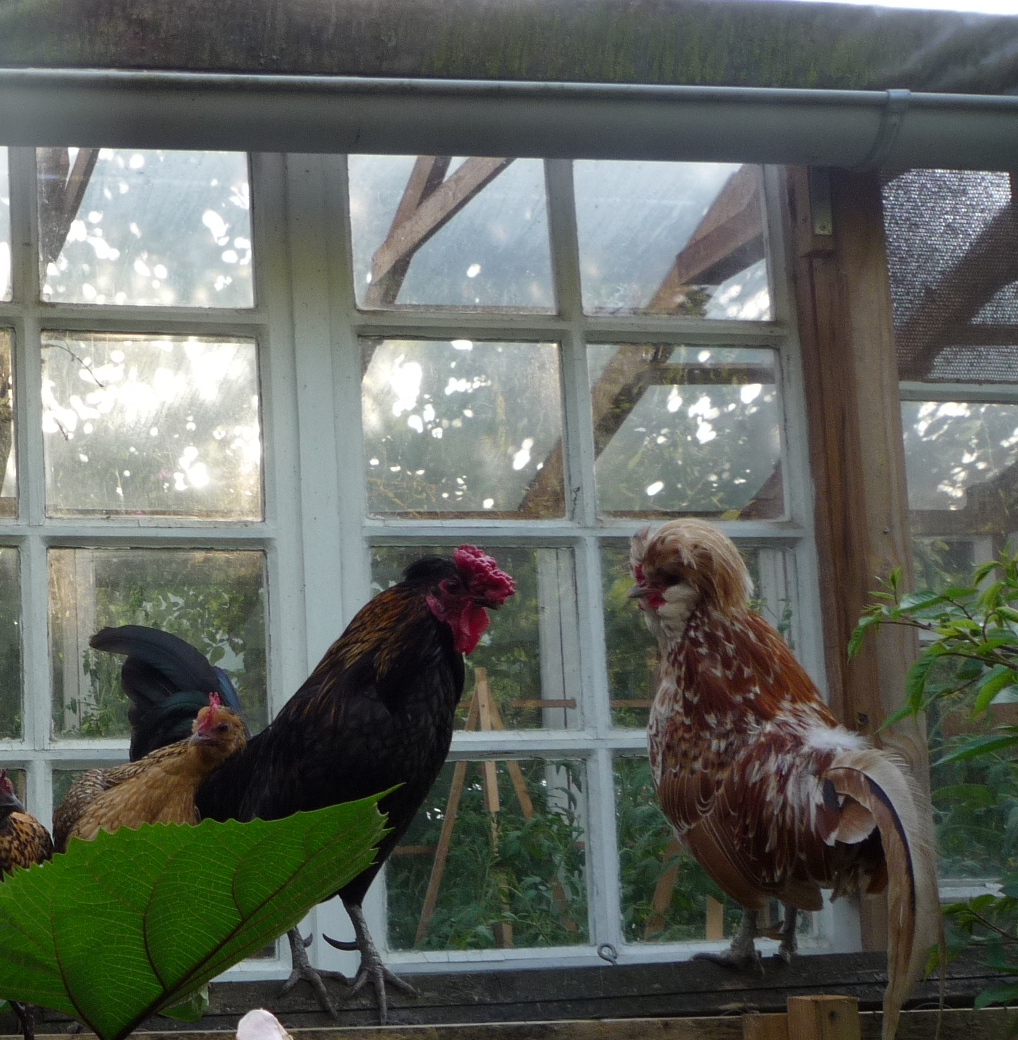 We had been collecting suitable materials for some time and in all we used 24 windows/French windows of various ages and designs but which overall seemed to fit pleasingly together. The sides and the back were to be made of windows set on pallet wood walls, similar in design to those of the hen house. On each side there was also to be guttering for the collection and harvest of rainwater.