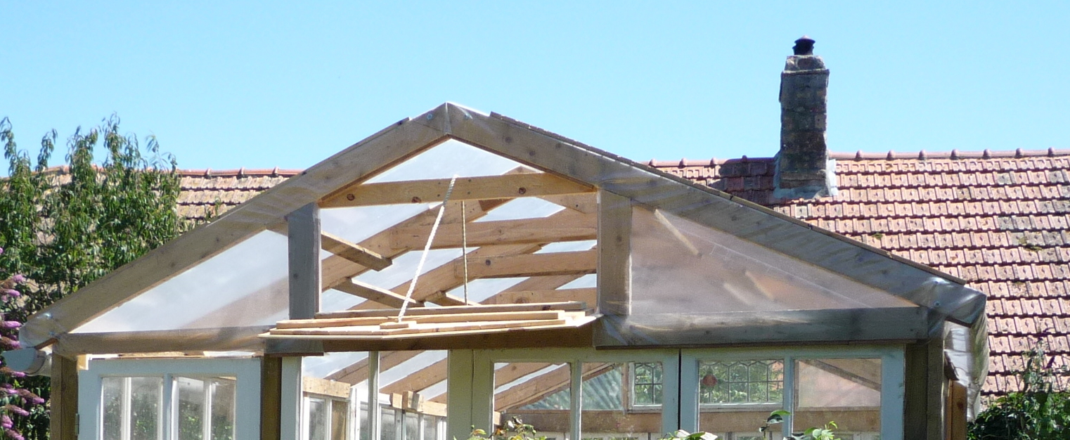 The roof covering was to be of 200 micron polythene UV stabilised (polytunnel material) and this could be purchased here in France by the metre and was 7.5 metres wide. As the roof was to be gabled we bought a 4m length, the polythene width was more than enough to cover the greenhouse length.