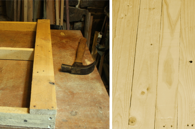 The wall panels were made from untreated pallet wood planks nailed to a rectangular frame. Each frame was also of pallet wood but I selected planks for this from more robust pallets approx 100mm x 22mm or 4" x 1". These planks were screwed together to form the frames and the pallet wood planks were nailed to what was to become the outside face thus forming a box.