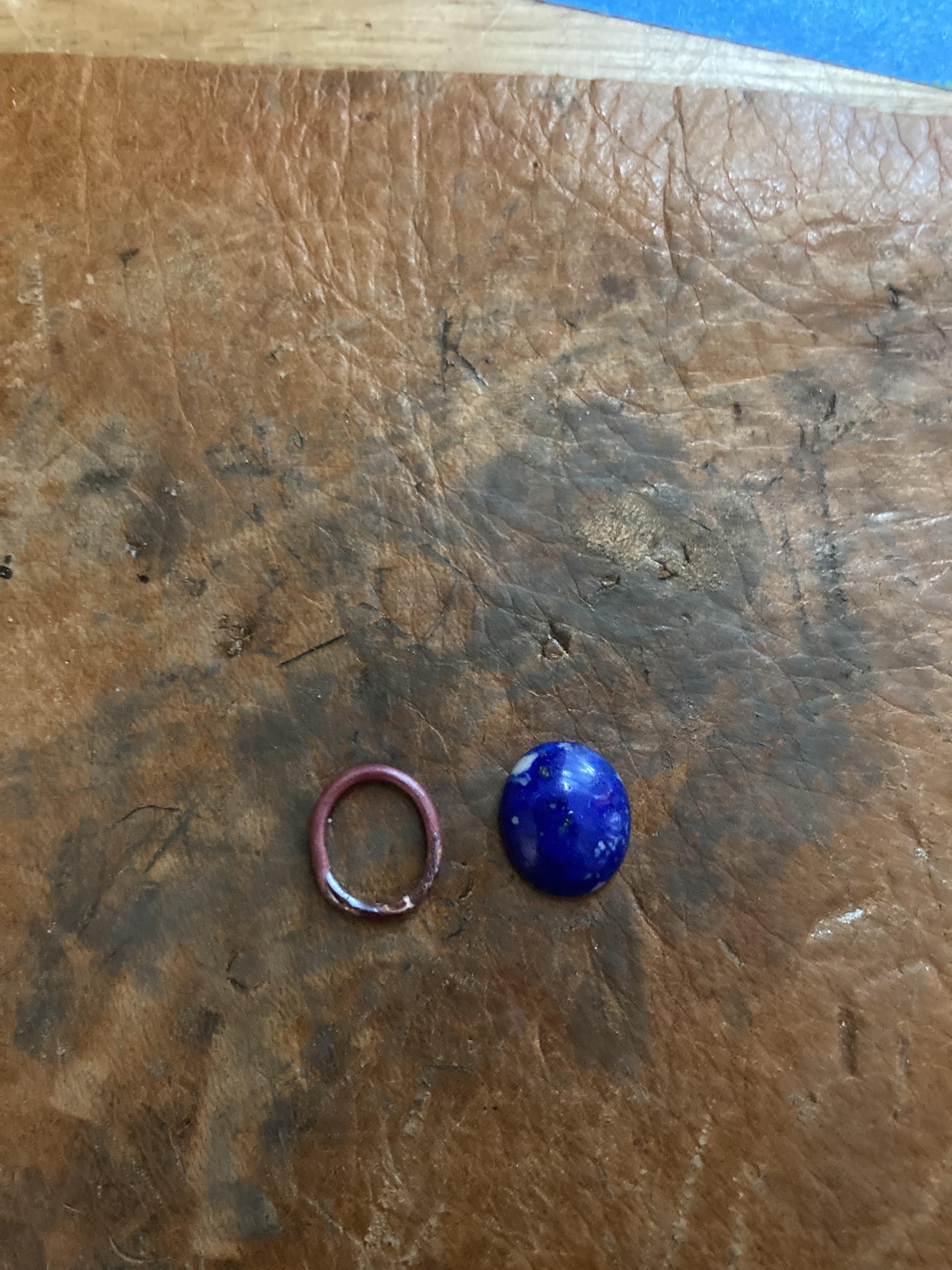 For this project, I am using three denim lapis cabs: two smaller(same size, for earrings) and one larger(for pendant). I got them, as stated before, at a little store in Albuquerque, but you can get a lot of sizes of a lot of different cabs on pretty much any jewelry supply site. Just make sure you also get a mandrel in the same shape as the stone if possible.