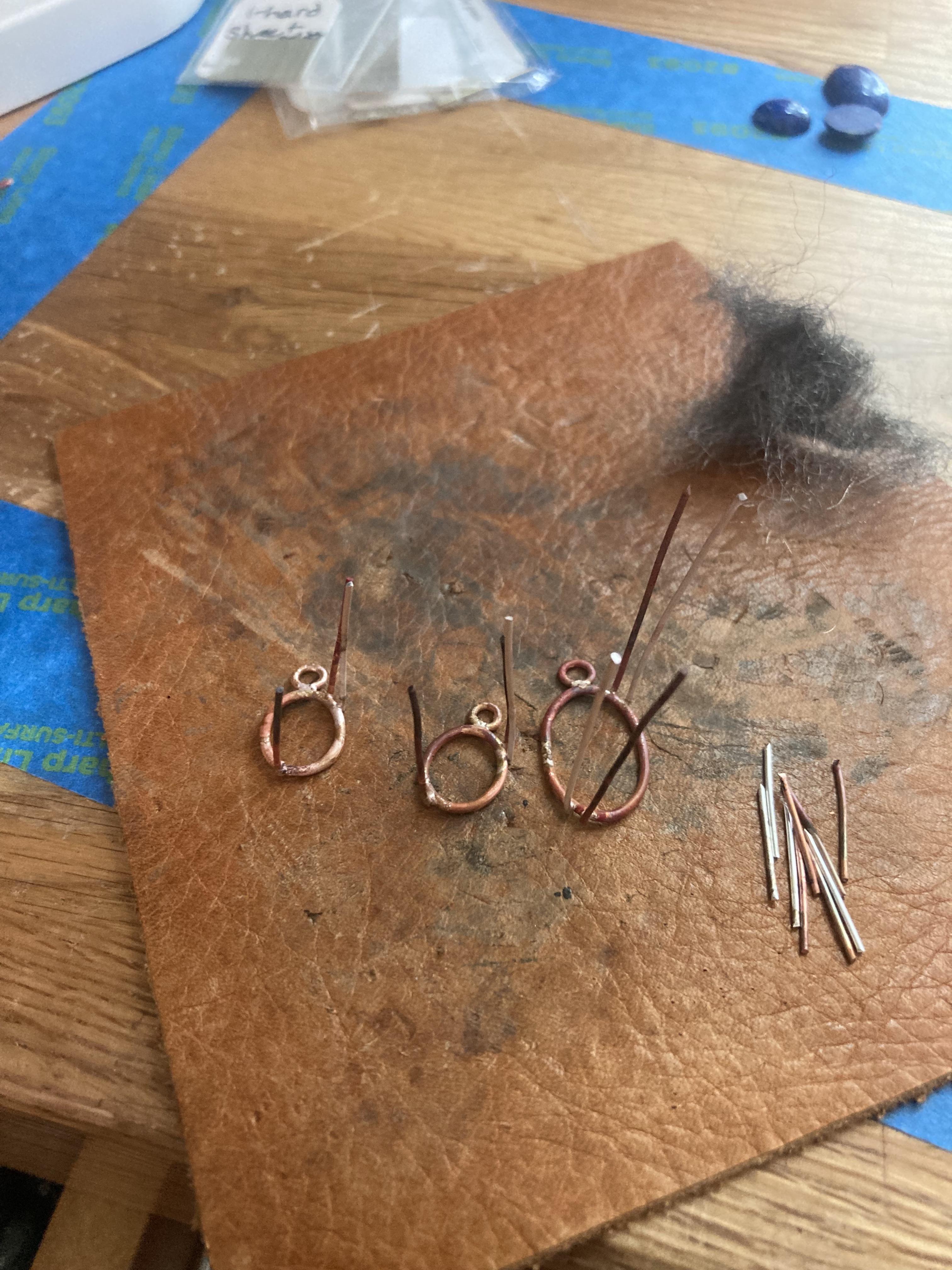 To have a way to attach things to the frame later (earring hooks, a chain) we need to have jump rings soldered to the top of the frame. The simplest way to get jump rings is just to buy them, but be careful about which ones you buy. A lot of them are just plated, and the plating will come off in the heat of soldering, so I usually just make my own if I'm going to solder them to something.