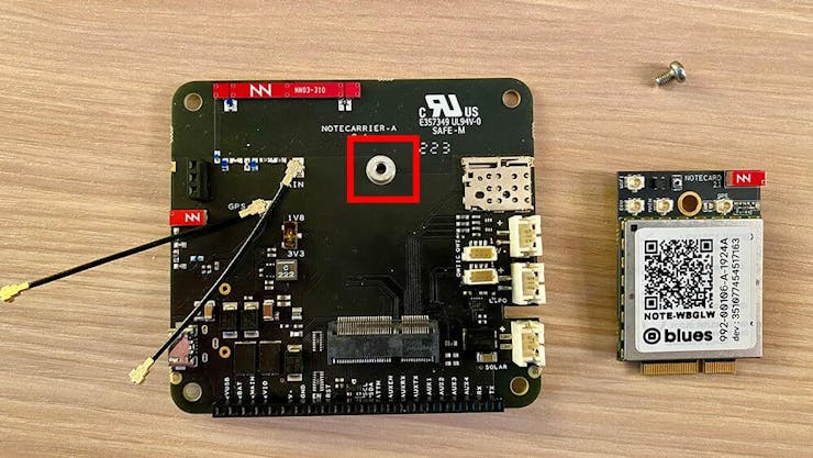 First, Remove the screw from the mounting receptacle on the Notecarrier and rotate the U.FL cables away from the M.2 socket.