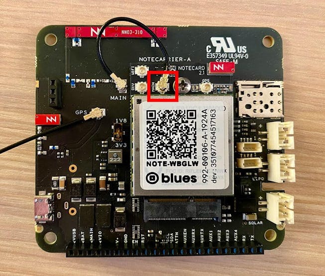 Secure the free end of the u.FL cable connected to the socket labelled MAIN on the Notecarrier to the MAIN socket on the Notecard.