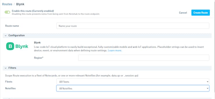 Next, we need to create a route to Blynk. A Route is an external API, or server location, where Notes can be forwarded upon receipt.