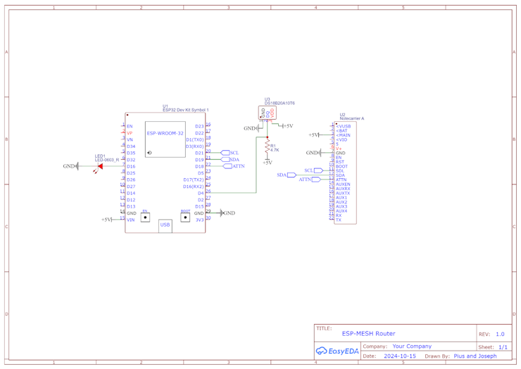 The Router is an ESP32 connected to a DS18B20 temperature sensor and a Blues Notecarrier.. Connect the temperature sensor and the Notecarrier to the ESP32 according to the schematic diagram below: