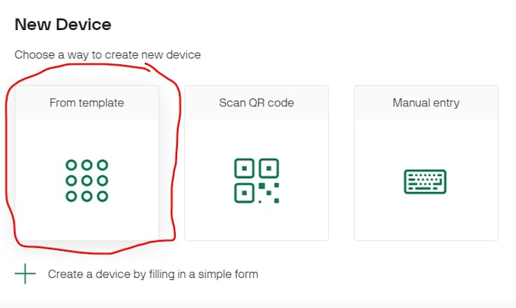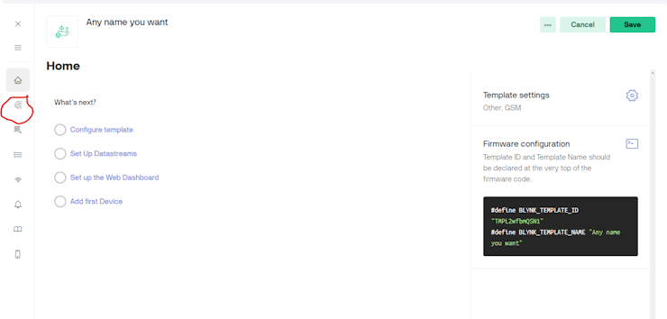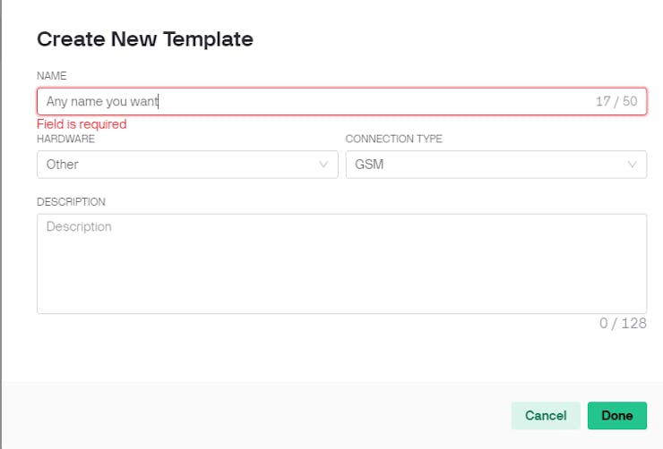 Click on + New Template and input your device name, in the boards' section select other and for connection type choose GSM.