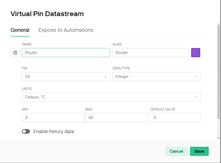 Give your Datastream the same name as the device you want it to represent. For example, for the Router, the DEVICE_NAME is Router, which is the same name as the Datastream above. This means the temperature readings of the Router Device will be published to the Datastream Router.