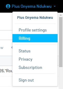 To view your Notehub credit click on your name at the top right corner of Notehub and select Billing.