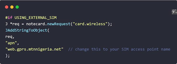 The cellular Notecard has an embedded SIM which it uses by default; however, If you are using an external SIM card, like me there are some variables you need to change in the code.