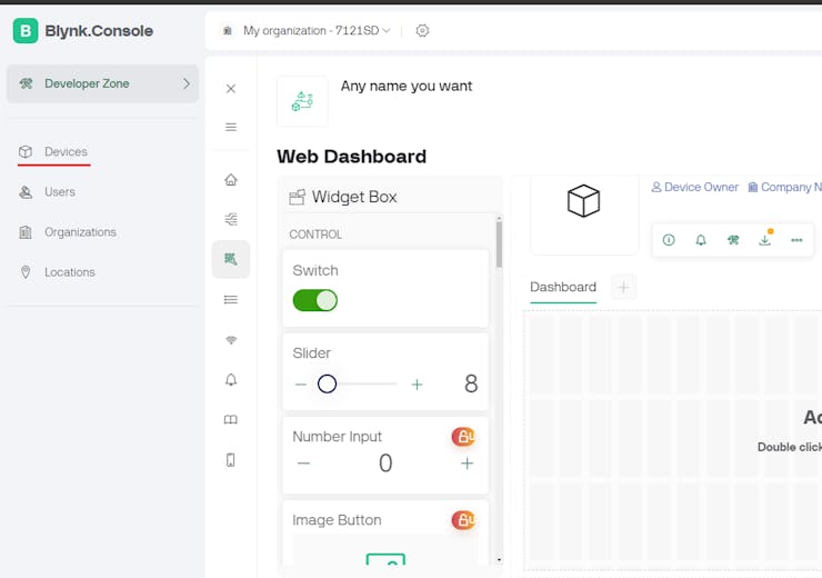 Now click on Save and Apply in the Blynk Console to save your changes. Next, we create a device; In the Blynk Console click on Devices.