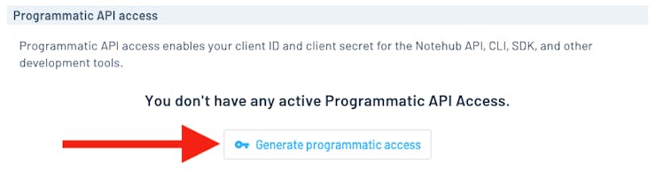 The next dialogue will ask for a Client ID and Client Secret. To get them, return to your Notehub project, go to the Settings screen, scroll down, and then click the Generate programmatic access button.