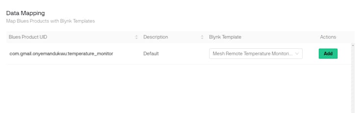 After connecting, scroll down in the dialogue and find your Blues ProductUID. On this section's dropdown select the template you created earlier, and then click the Add button.