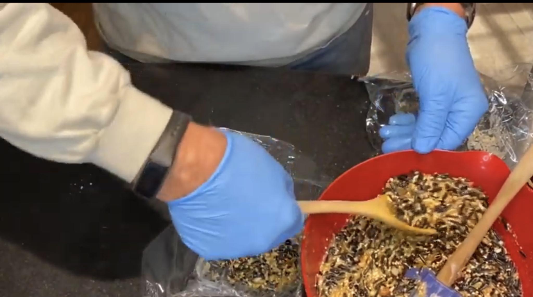 To crush the mealworms, I put them in a sandwich bag and crushed them with my hands.