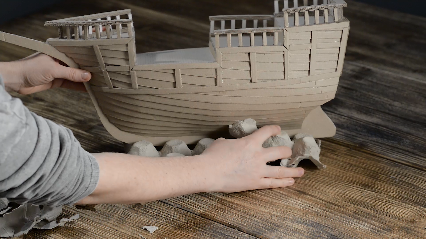 I needed a stand for the ship so I decided to go for a rocky one, full of textures. I made the stand out of egg cartons. I broke the carton into smaller irregular pieces and glued them together. This type of carton is easy to bend and glue in any shape you want.