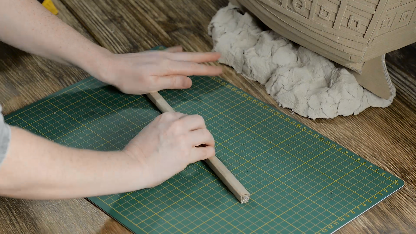 I made the main three pillars by rolling and gluing the cardboard until I reached the desired thickness. One pillar is about 20 mm thick. The middle one is the tallest and it has 360 mm, the one in front has 320 mm and the last one has 220 mm. I made patterns for the sails also. 1a and 1b are for the front, 2a and 2b are a little larger and are for the middle and 3a is for the third pillar. I made the curved sails by gluing two pieces of cardboard together and bending them while the glue is still hot. I used the cutting mat to help along with the bending. I added threads as best as I could. I am no expert in this so I used some Google images for reference. Even though I had no idea of the correct way this should be done, the threads added a realistic effect to the ship, and this aspect was all that mattered to me. I glued the ends of the threads using super glue.