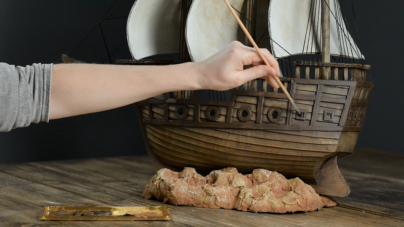 I covered the surface in a dark color first. This will serve as a base. Make it go in all the cracks and the deepest holes. It will act like a shadow and contrast layer when we add brighter colors. I add a brighter color only to the surface of the texture, gently rubbing the brush with very little pigment so I don't get it in the cracks. On top of that bright color you can add other colors as well. You can make it brighter and more colorful, it's your choice. I went for a wooden look for the main body of the ship. I painted the sails white first and then added a diluted brown to the top and spread it gently and dissolving it to the bottom until the sail looked older and used. I hope you liked my instructable and got some inspiration to start your own projects. Have fun!