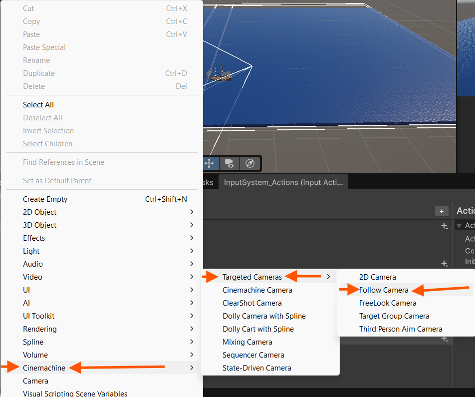 To make sure your camera follows your ship, I'm using Cinemachine. Cinemachine makes sure that your camera moves smoothly and does not make your player get a headache. To attach Cinemachine to your Main Camera, right-click in your hierarchy, then find the Cinemachine option → Cinemachine Camera.