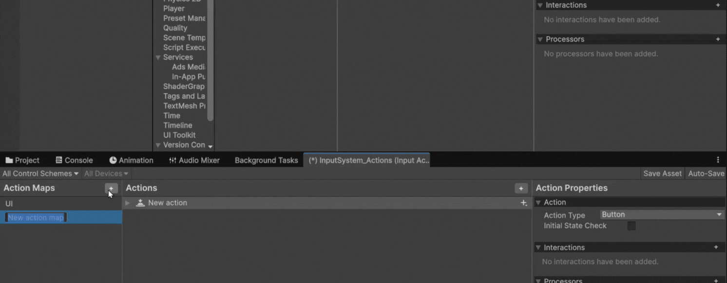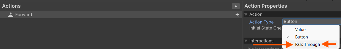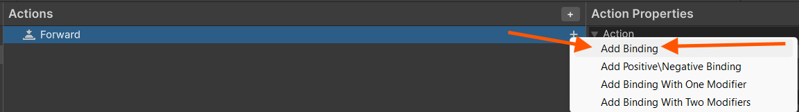 In Unity's new input system, you have to do some work ahead of time to ensure that your buttons trigger the script. Go to Edit → Project Settings → Input System. There you will find two pre-made input maps. Delete both of them and make a new map called Player. You will find a pre-made action in the already. Just rename that to "Forward". Also, locate the box labeled 'Action Type' and change it to 'Pass Through'. Click the plus button on the right side of the "Forward" row and then click Add Binding.