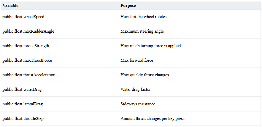 Depending on the type of boat you have, you will need different values for the physics variables. For example, if you have a jet ski, you might want to turn maxRudderAngle up. Or if you have a cargo ship, then turn maxThrustForce down and set throttleStep to something like 0.1.
