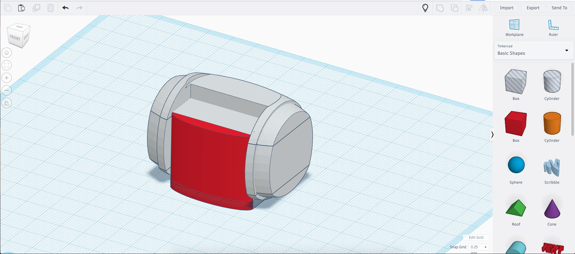 Add the bouncy ball container and the tube bridging it to the main blaster. You can do this using cylinders, half spheres, and regular spheres.