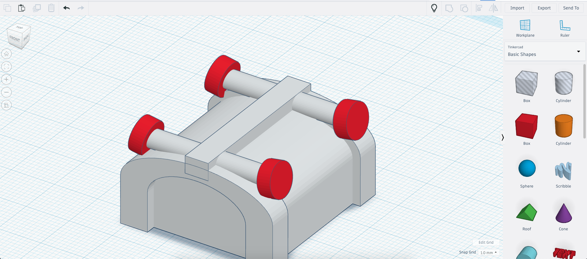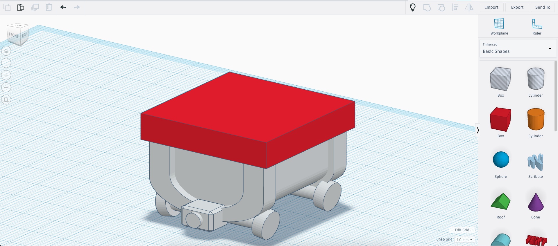 Next, we add the front link to the mine cart using a rounded rectangle and a small cylinder. If this were a real mine cart, it would likely be used to link several together.
