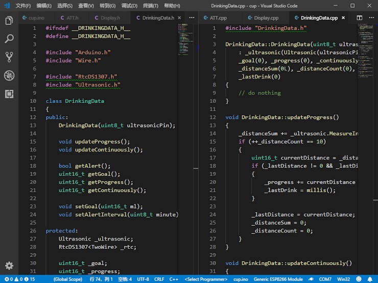 For controlling OLED, we create a class named Display, then we can call showDateTime() method, showProgress() method,showContinuously() method and showAlert() method to display date & time, drinking progress & goal, how many days reached the goal continuously and drinking alert in OLED.