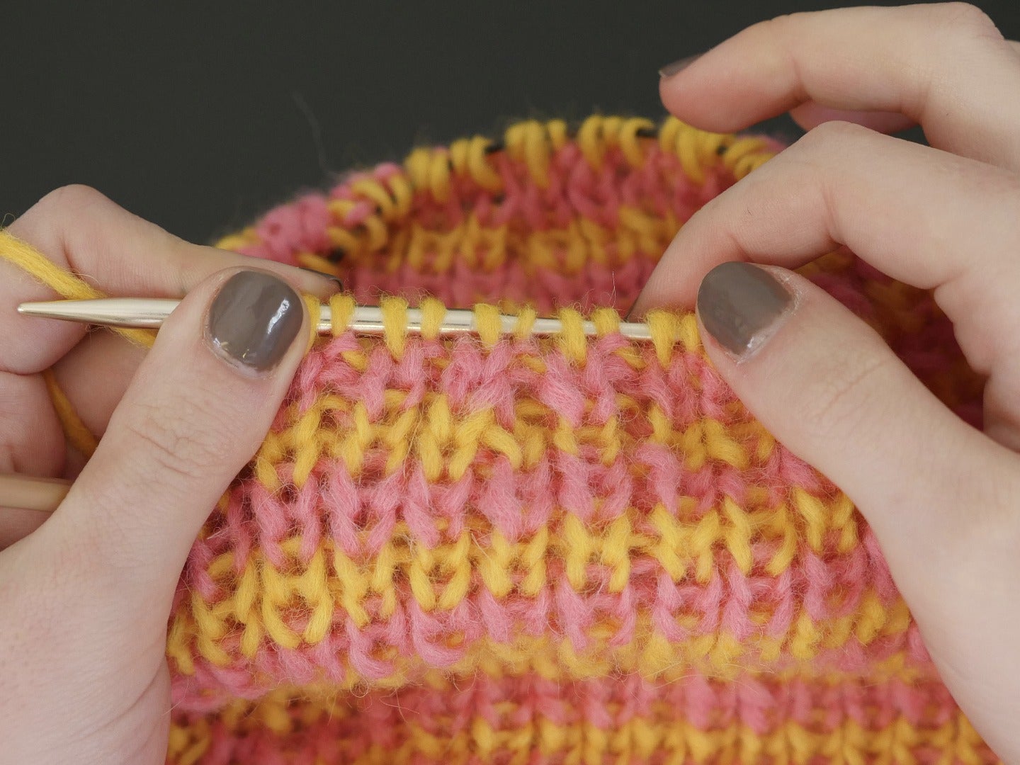 To shape the top of a hat, we’ll decrease the number of stitches incrementally using a stitch decrease called “knit two together.” Reducing stitches every other row will create a gradual rounding of the hat culminating at the apex of the dome.