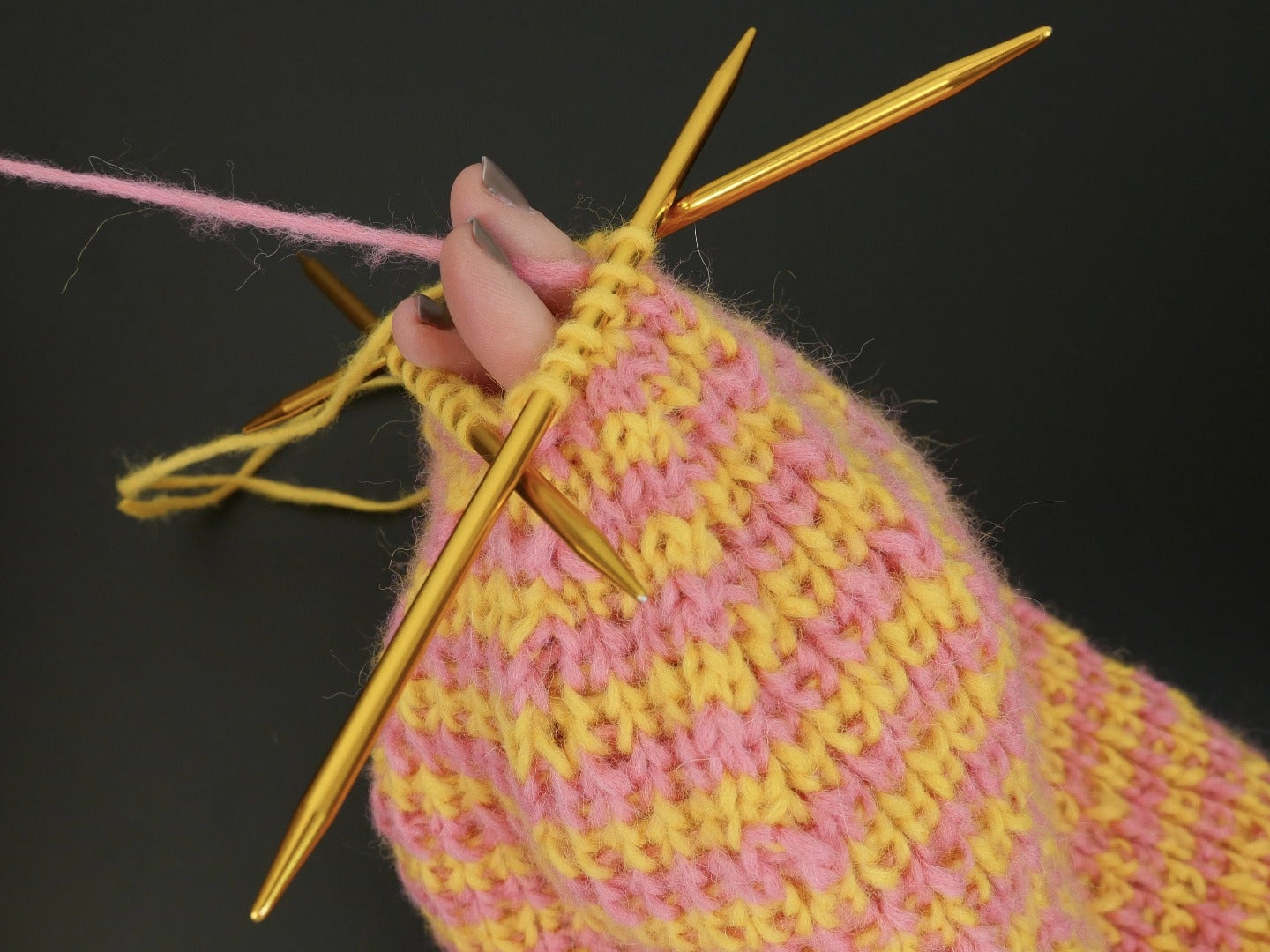 To knit the next row, position the first DPN on top of its neighbors, and pick up your fourth DPN. Knit all the stitches from your first DPN onto the new one (remember to count stitches and perform decreases), then your newly emptied needle will become the right needle for the following set of stitches. You are still knitting in the round, but now the round can shrink smaller as the work does. Continue alternating decrease rows until 16 stitches remain.