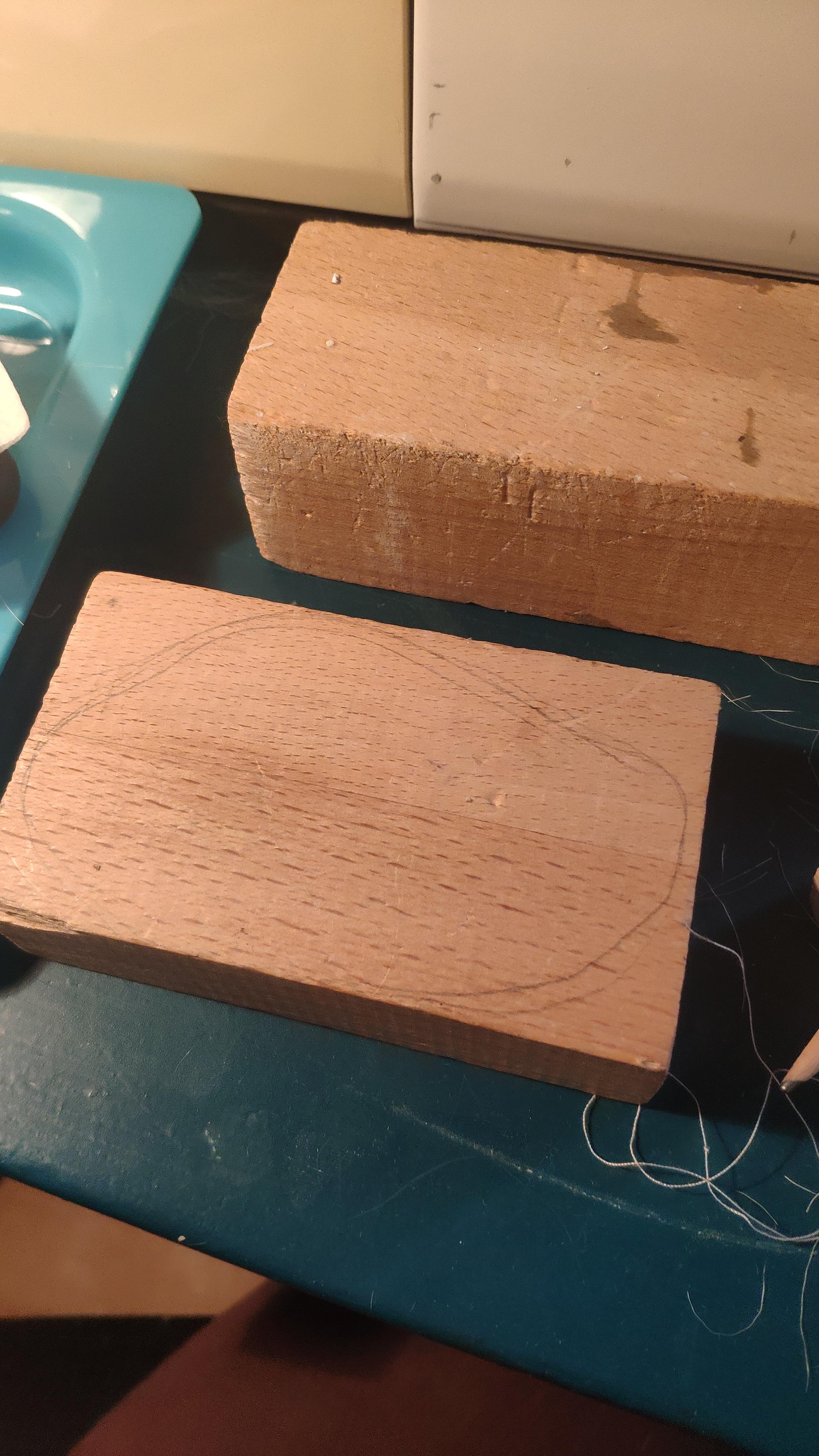 I decided to have this organic shape that you can hold comfortably in your hand without the prolonged handle. I just found some scrap pieces that looked usable and drew the shape on wood from the top and shorter and longer sides. Then I cut out the basic shape with a band saw For some cleaning the cut I used sanding machine, chisel, and for finishing shape I used hand rotary tool. I also sanded it to smoothness with some sanding papers. The shape is not as I imagined, but my big sanding machine actually burned in the process so I didn't take off as much material and dint filled that much.