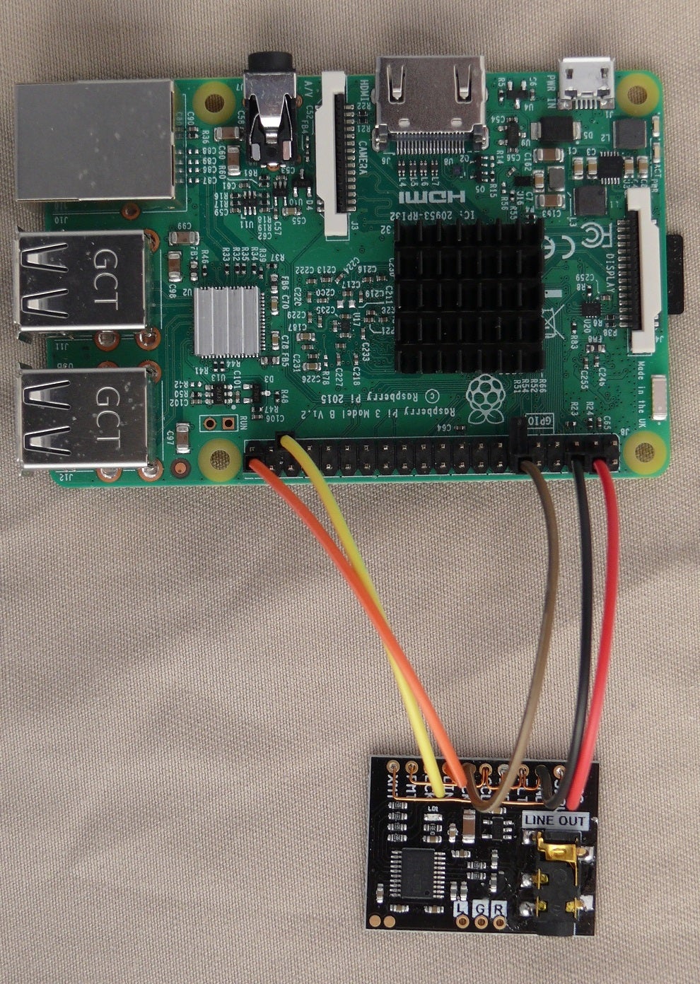 For the leads to the Pi I cut some Dupont leads in half and soldered the cut end to the board. Next time I would make up leads as the wire in the Dupont leads was thin/weak.