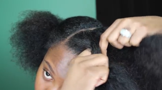- Place the hair that was once in the center to the right side, rotate the hair in your left hand to the center. (Right Picture)