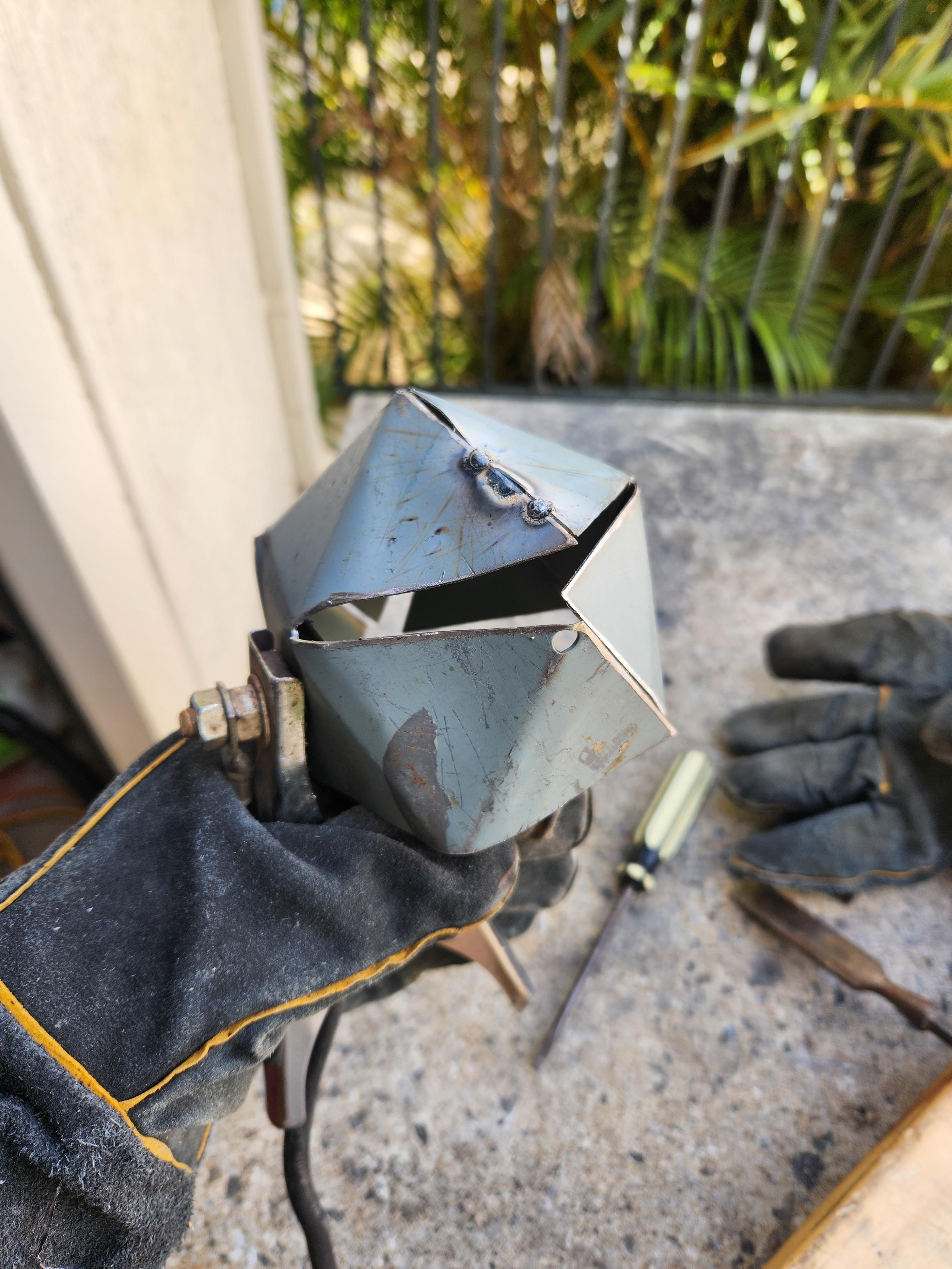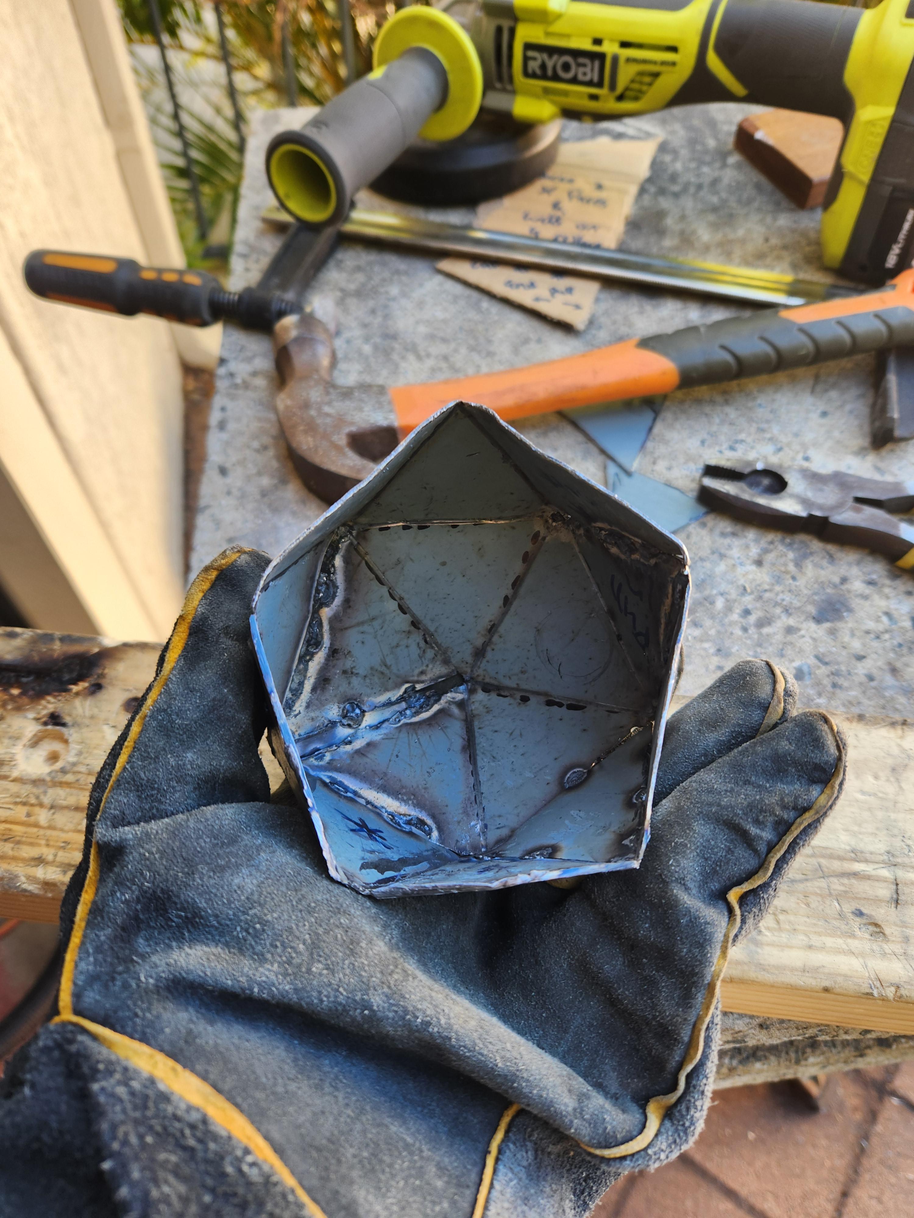 Once you've formed your metal into its desired shape, it is time to weld all the edges. I deliberately added too much weld so that I could grind back sharp corners. You should do all your welds on the outside, and then hold it up to the light to look for any gaps in your welds. These gaps can be filled by welding on the inside. I had a nasty hole on one of my points, but with enough patience and weld, anything can be fixed!