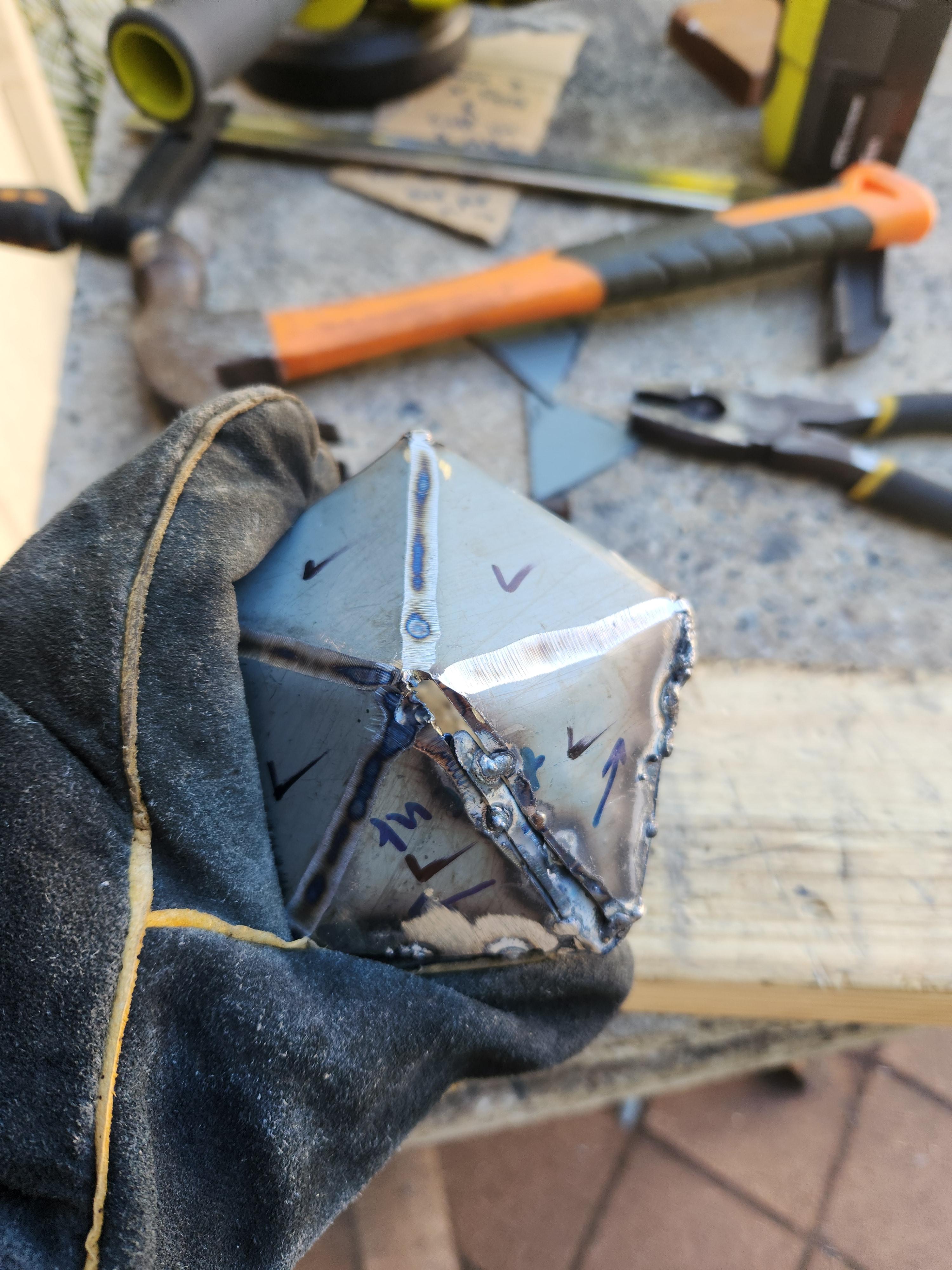 I ran into 2 major issues. First, I had cut one of the triangles too short, and hence 2 faces had a huge gap that I couldn't bridge with weld. And second, I didn't originally score my bend lines deep enough. To fill the gap, I ground down a small offcut into a thin length of metal and welded that across the void. I was too far into the bending process to simply unfold and rescore my lines, so I did a 'reverse score' and ground down some of the material from the outside, this meant the bend line had an overall smaller thickness, but it also meant I needed to weld over those grinds at the end to get a sharp meeting edge.