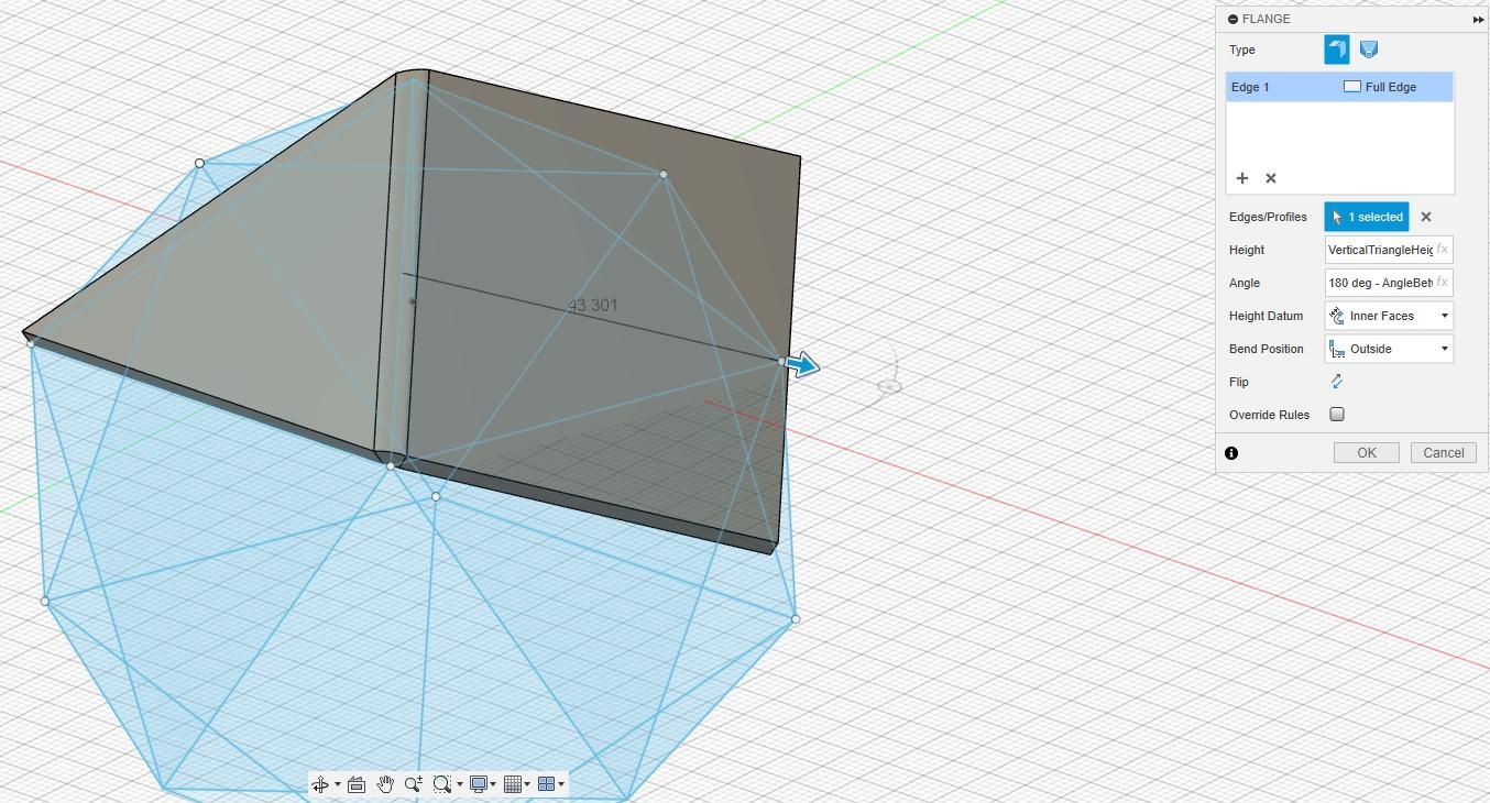 The process I used to create all the bends in this model involved starting with a Flange on one of the triangular faces. Then, I created another flange from the bottom edge of the original one. This new flange has a height set to the "verticalHeight" parameter we established earlier, and it's bent at an angle of 180 - "the angle between faces" parameter we previously set up. You can see this in the screenshot below.