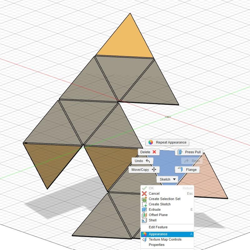 By returning to the model, and unfolding it, we should get the same layout as the flat pattern generated. To help us remember which faces we want to move and where to reattach them once the model is refolded, we can modify the Appearance of a face by right-clicking it. By setting the face you want to move as well as the target face that you want to reattach it to, as 2 different distinguishable materials, you can refold your model and make the change. You can see this below;