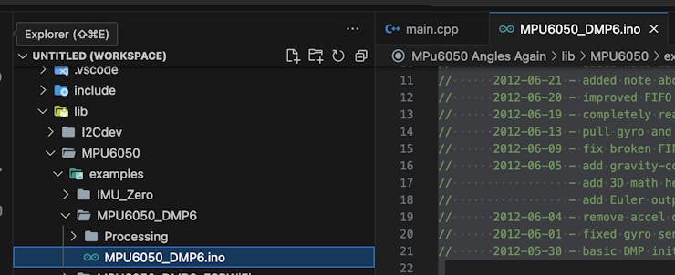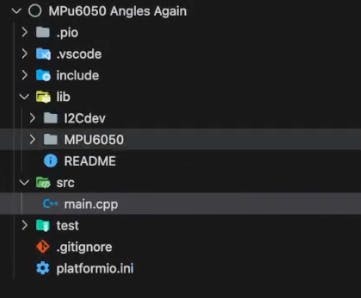 Unzip the contents and move both the Arduino/MPu6050 and Arduino/I2Cdev code into your lib directory in PlatformIO. We do not need all of the source code in the repo, in fact, most of it does not pertain to our use case! Our project structure should look as follows: