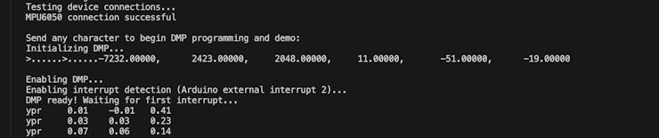 Simply copy the contents from the MPU6050_DMP6.ino into your main.cpp file in the src folder of your project. Change the default baud rate to 9600 and upload the code to the board. You should be prompted to enter any key to proceed with DMP. The first time you run the code you will need to replace the offsets it gives you shown below. Subtracting the offsets is needed to have more accurate angle values, all sensors come with some inherent bias and need to be calibrated. Thankfully the library does that for us we just need to substitute the offsets into the code accordingly. In my case, it gave me the offsets shown below: