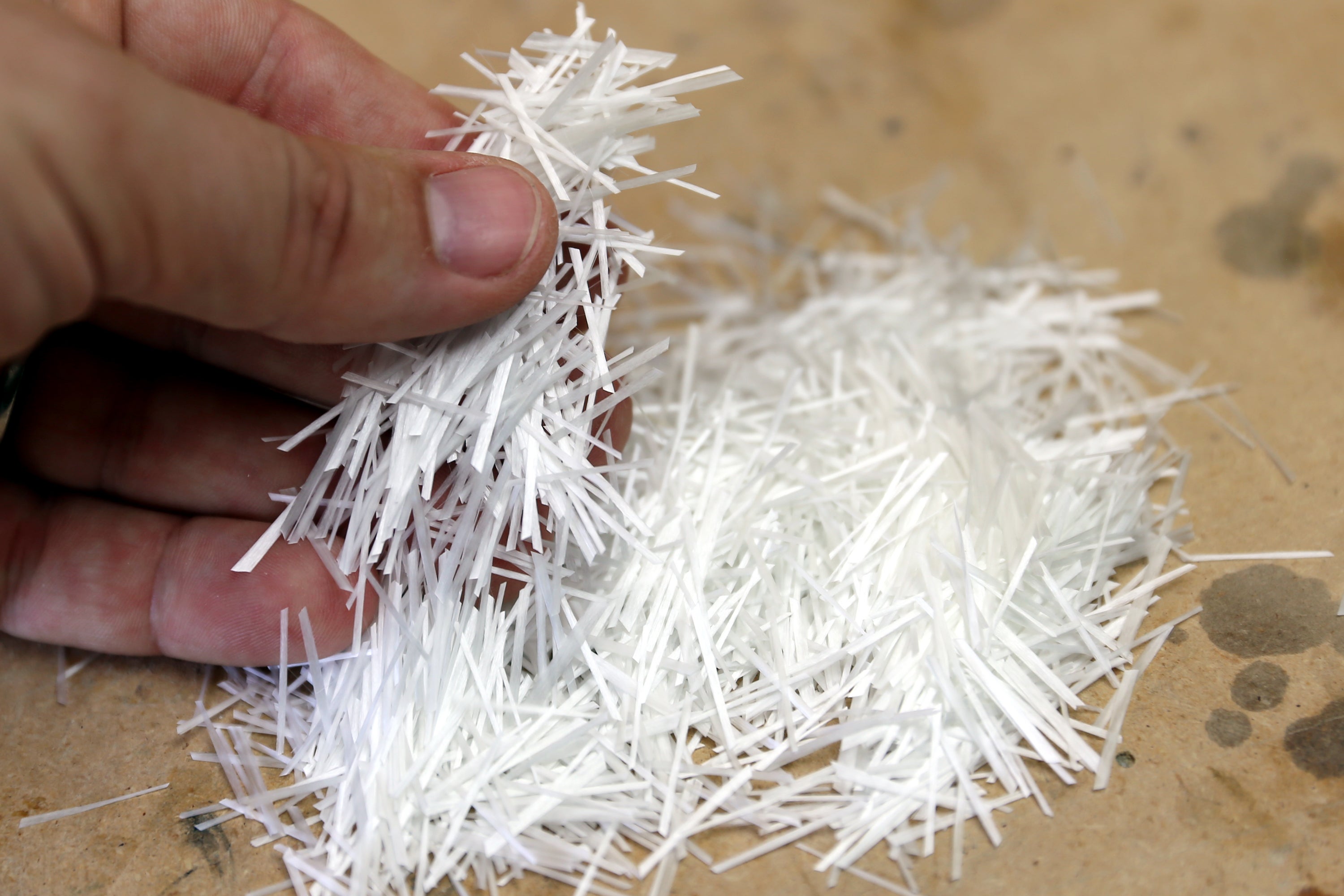 Another great advantage of fiberglass is that if the concrete ever cracked and there was water ingress the fiberglass can't rust and compromise the concrete like steel could. The idea of these fibers is that they provide tensile strength in all directions, so any cracking that could occur as the concrete shrinks while it's curing are halted by the fiberglass.