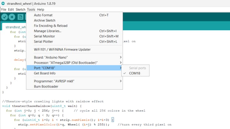 Next, open up the strandtest_wheel sketch and change the pin to 2. Because we have connected our Neo pixel to the D2 pin of the Arduino.