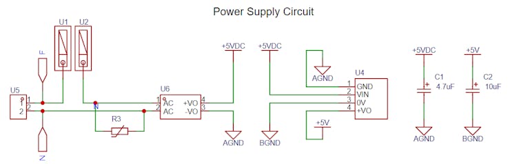 The circuit below represents the power supply block of the electronic project. The first stage of the project consists of a screw connector that allows powering the circuit board directly from the 220VAC electrical network.