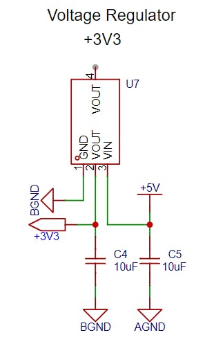 The +5V isolated voltage source is used at the input of the +3V3 voltage regulator circuit.