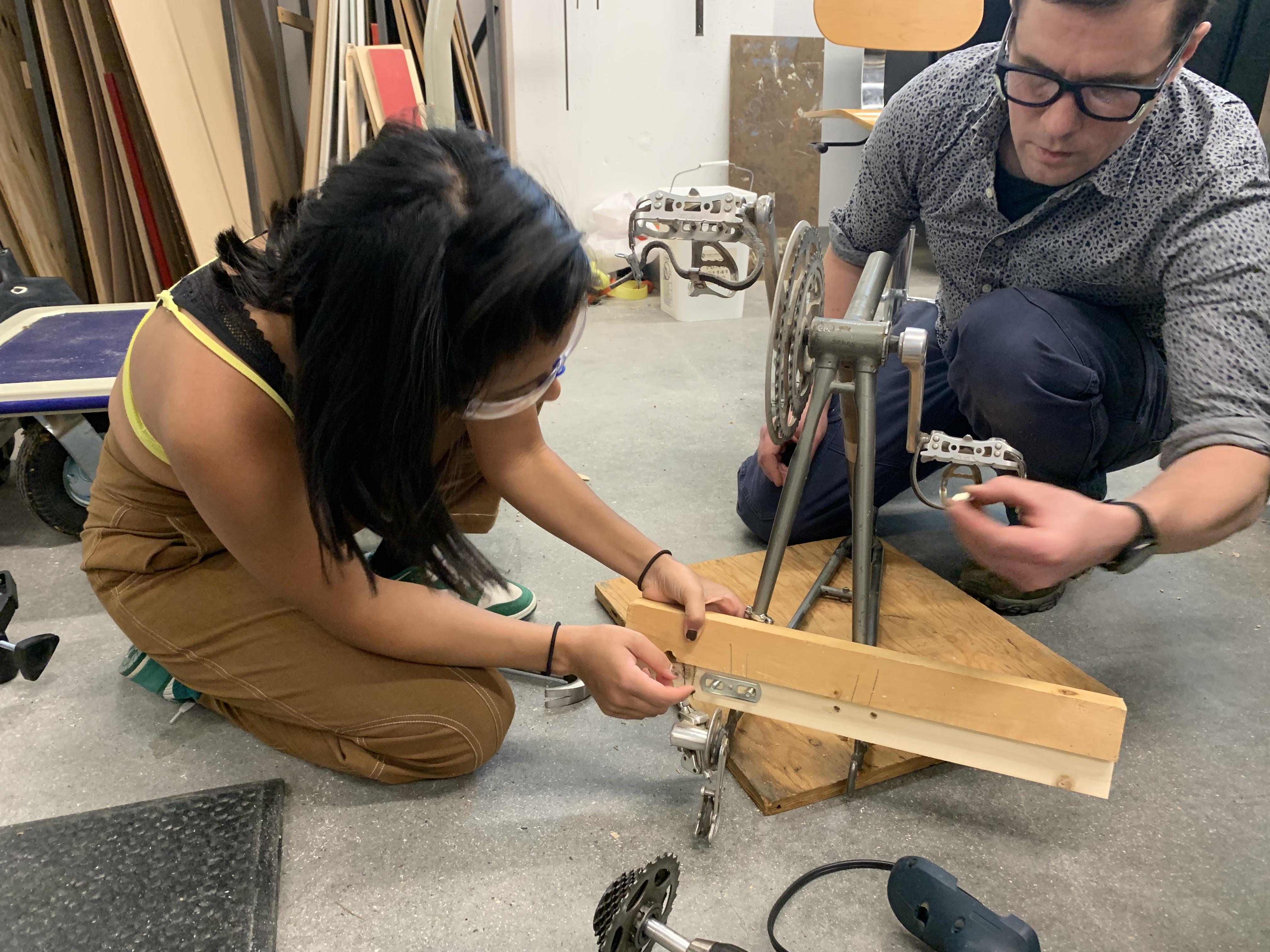 Then, attach the 2x4 wooden plank attached to the drill to the 2x4 plank attached to the bike frame. Make sure the gears on the drill and the bike are aligned.