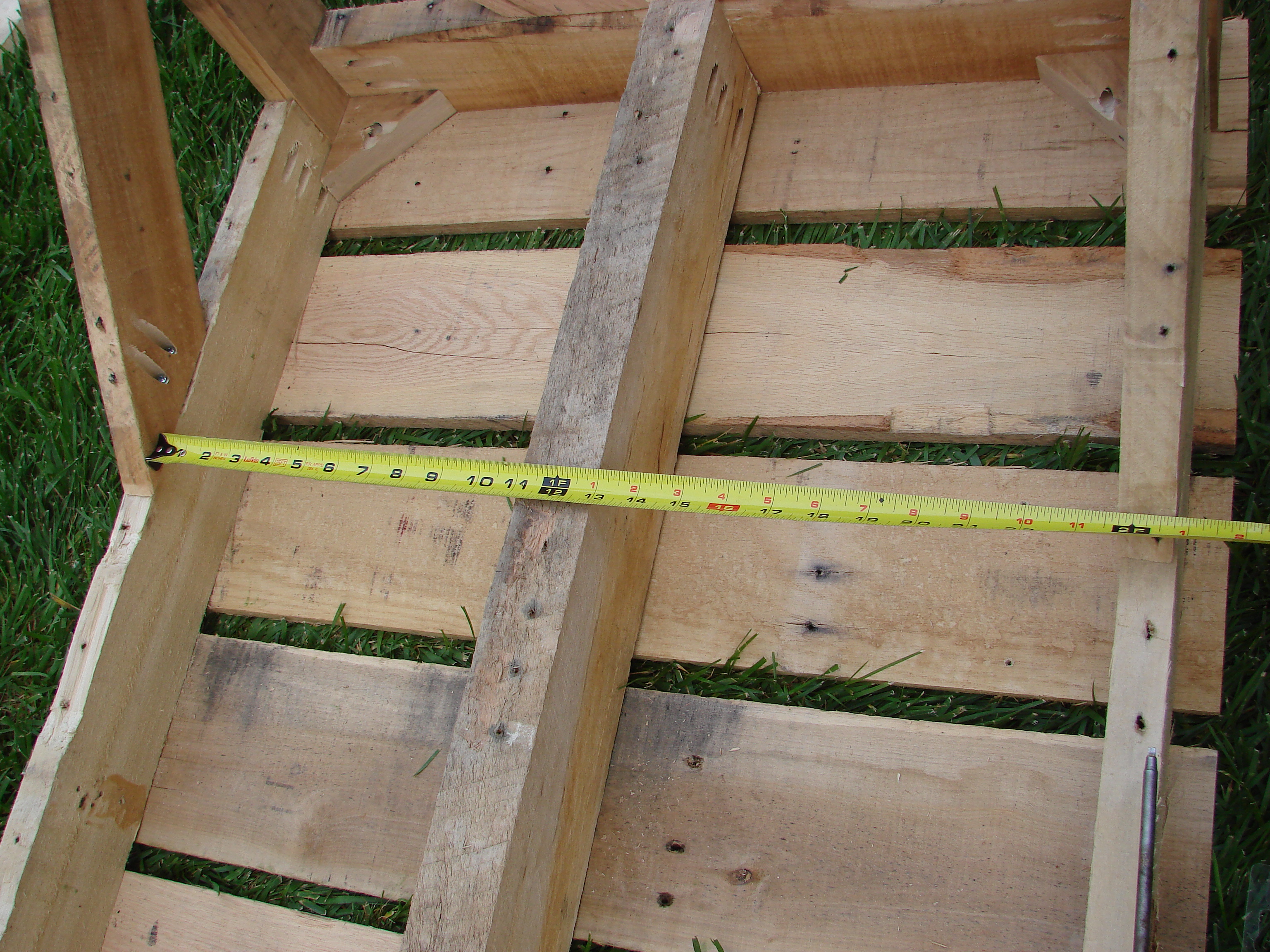 But what if I’m wrong? This thing could tip over and hurt someone really badly. So I made another foraging trip and came back with an additional pallet. This was a 60” standard pallet. The beams and decking planks were much thicker than those on a 42” pallet and would have made a good pallet to start this build with. The beams are roughly 2” thick on the 60” pallet versus 1-1/8” on the 42” pallet.