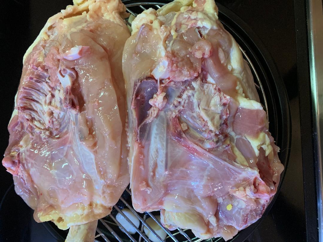Place the chicken halves, side by side, skin side down on the Nuwave Oven rack.